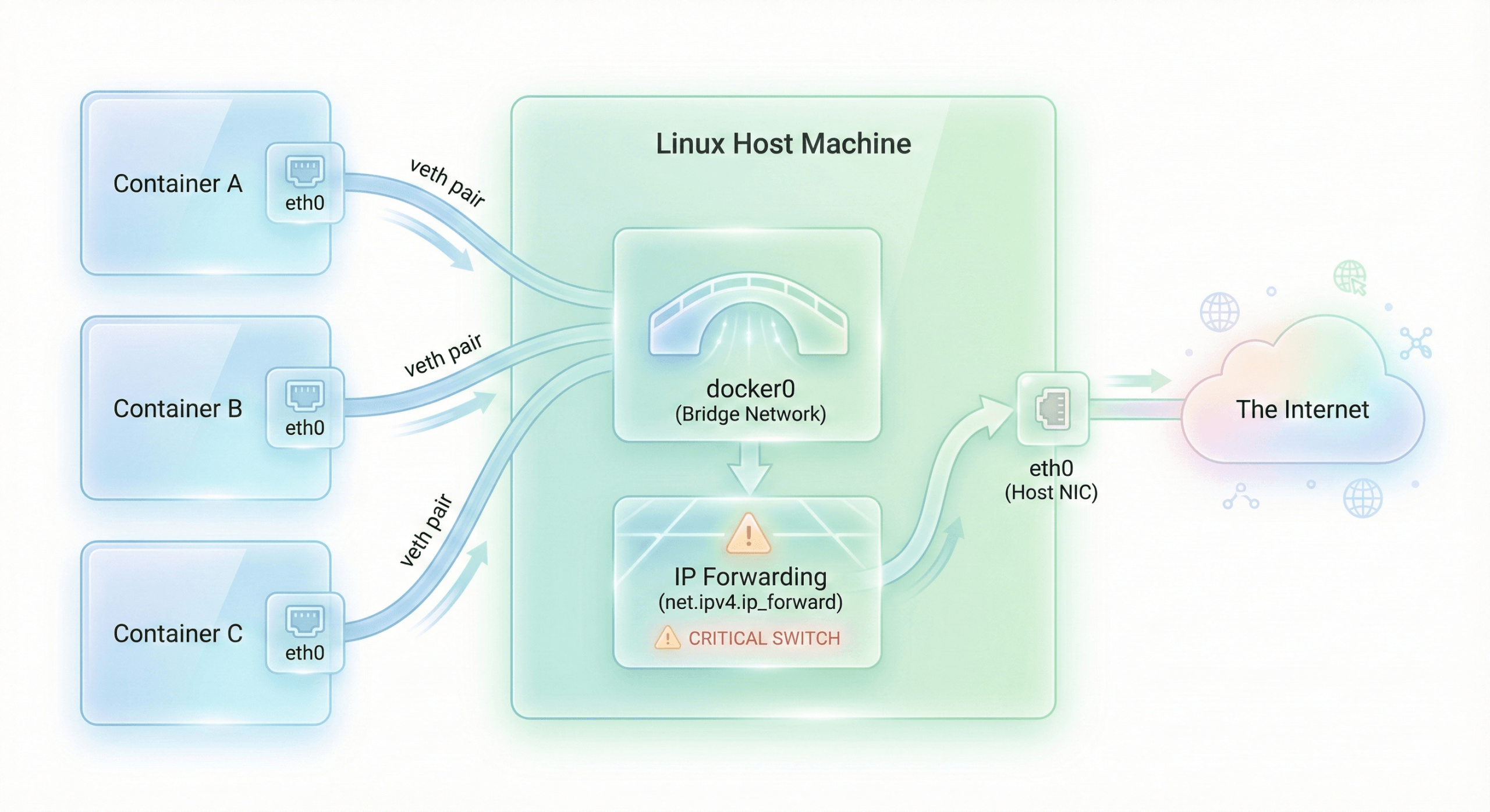 所以现在container中发不了请求,但host machine网络通畅,有可能是ip forwarding没打开。